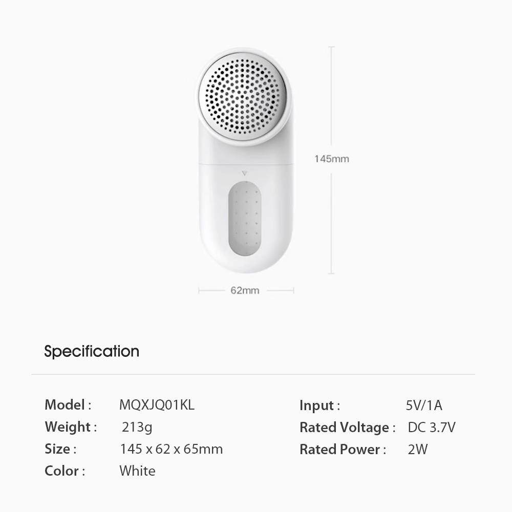 Description: Mijia Lint Remover - home necessary tool for maintaining your clothes madeof different type of material including woolen cloth/wool fabrics/cashmere/silk. Features: 0.35mm thicken steel net with all-new optimized net hole design can effectively remove the hair ball of cloth and not damage it. 5-blade floating cutting plays main role on cutting the lint, delivering a good use effect. Powerful suction: New centrifugal fan blade + P-shape anti-backflow duct design 1300mAh : 2 hours of charging time can supply Max. 90 minutes endurance. Dual-layer Protection: The device will automatically power off after opening detachable cover or storage bin to increase use security. Wide application for multiple cloth material: Woolen cloth/Wool fabrics/Cashmere/Silk Exquisite Details: Hidden Indicator + Visible Storage Bin + Clean BrushSpecification: Brand: Model: MQXJQ01KL Color: White Input:5V/1A Rated Voltage: DC 3.7V Rated Power: 2W Weight: Approx. 213g Size: Approx. 145 x 62 x 65mm Package Weight: Approx.350g/12.35oz Package Size: Approx. 16*8*8cm/6.30*3.15*3.15inNote: The actual lifespan may vary due to the different use frequency. Item color may show slight aberration due to different shooting light and monitor display.