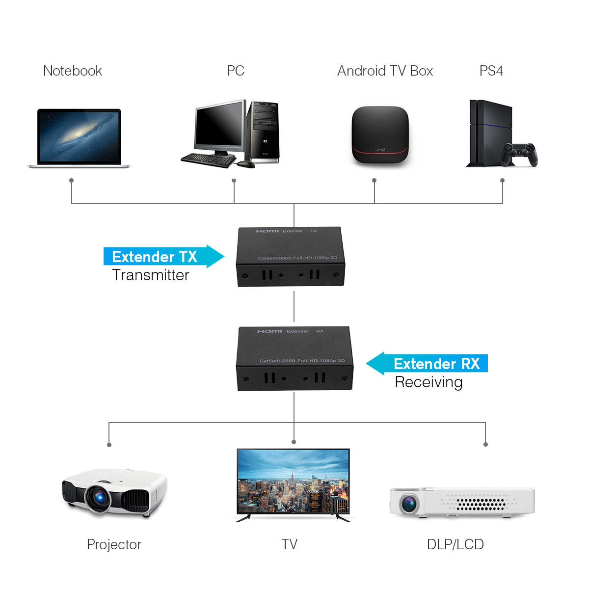 The HDMI Extender lets you extend HDMI audio/video signal by up to 60 meters (196 feet) over single Lan cable.