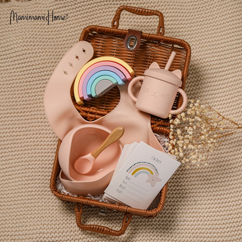 Mamimami Home Baby Meal Feeding Set 100% Silicone Bowl,Sippy Cup,Bib Natural Rattle Toy Toddler Gift with Rattan Box