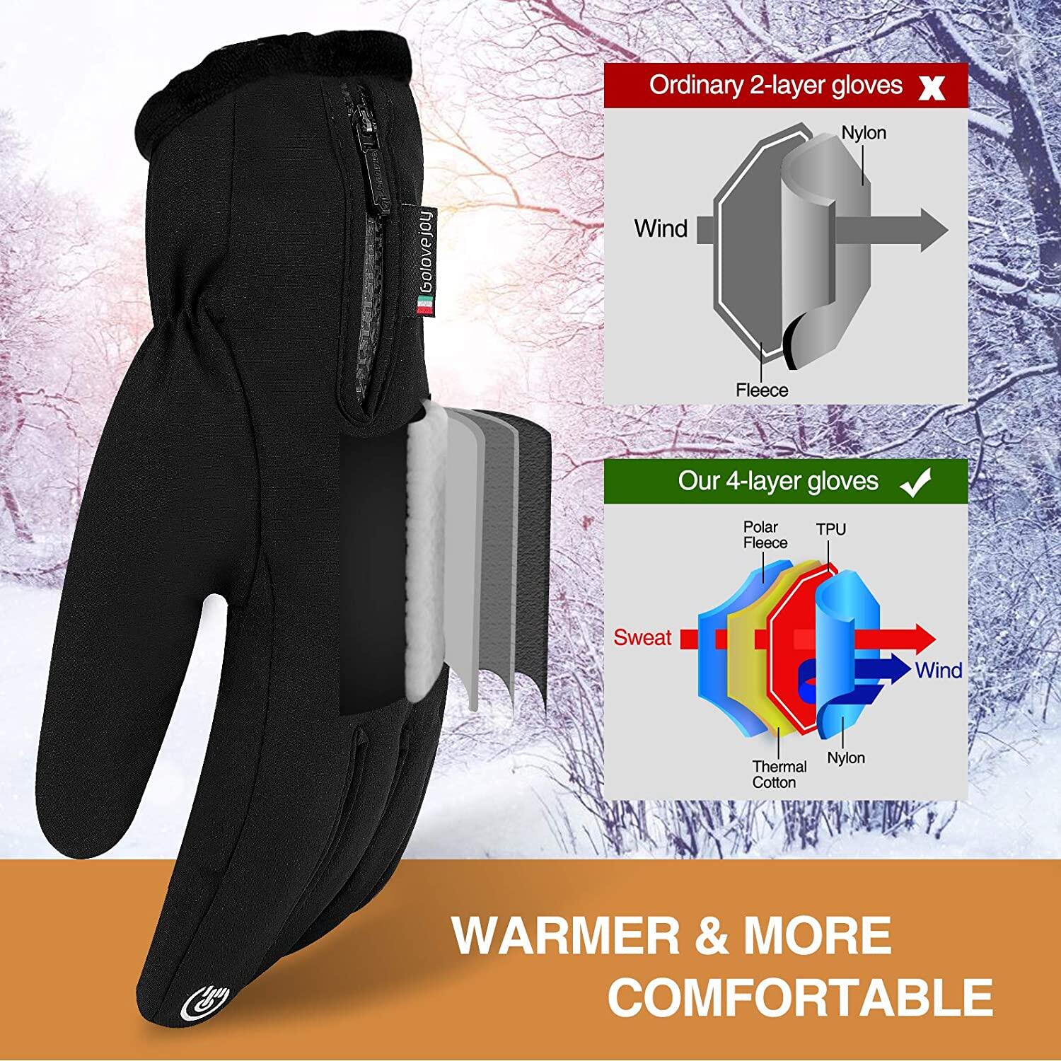 • UPGRADED 5 LAYERS EXTRA THICK PROVIDE MORE DEXTERITY - The warm gloves insulated with 5-layer thermal softshells keep hands warm in cold weather but lightweight for good packability. High Quality Polar Fleece lining of mens winter gloves is soft and skin friendly. 3M Thinsulate in the middle layer of snowboard gloves is isolated your hands from cold even in -30℉ weather. The cuffs of mens gloves is stretchy enough to go on and off easily, flexible and suitable for your hands in winter.