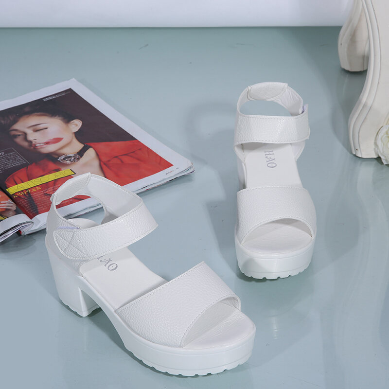 Summer Waterproof Platform 2021 New White Chunky Heel High Heel Large Size Women's Sandals Thick Bottom Velcro Fish Mouth Comfortable Shoes