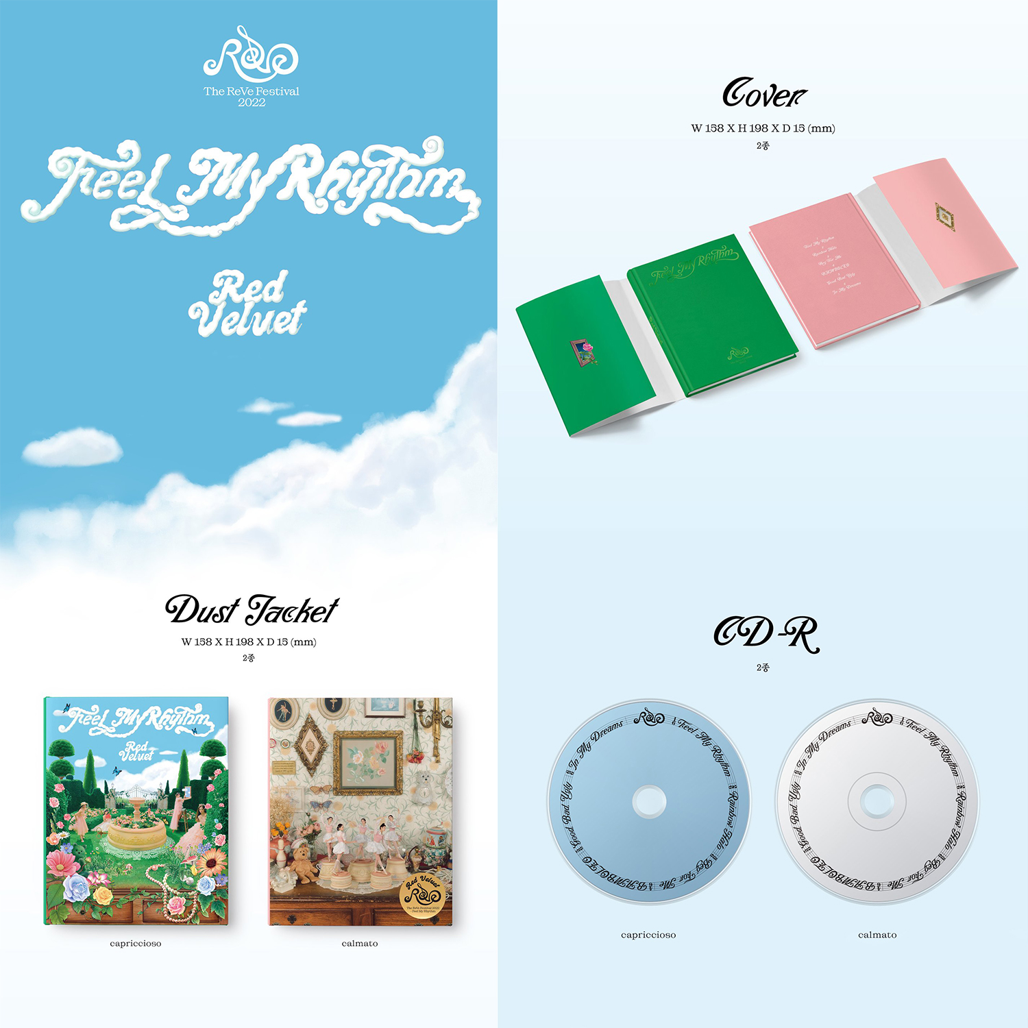 ❥ Red Velvet - Mini Album [The ReVe Festival 2022 - Feel My Rhythm] ✿ FEATURES ✿  □ Release Date   ■ 2022.03.22  □ Version   ■ ReVe Ver. (2 Type)  □ Components   [ReVe Ver.](capriccioso / calmato)   ■ Dust Jacket (2 Type)   ■ Cover (2 Type)   ■ CD-R (2 Type)   ■ 108p Photobook   ■ Sticker (Random 1 out of 2)   ■ Book Mark (Random 1 out of 5)   ■ Folded Poster (Random 1 out of 5)   ■ Photocard (Random 1 out of 10)   ■ Poster (Random 1 out of 3) * Poster is Optional ⯌ FREE GIFT ❥・•Only TrendK Store Gift~❥  ? 2 Red Velvet Print Badges  ? 4 Extra Photocards ✶ Free gift's image may change without notice. ✶ Even if you purchase multiple albums, only one of the same Free Gift is provided.