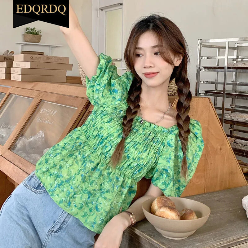 EDQRDQ Floral Off Shoulder Blouses Chiffon Summer Puff Sleeve Fashion Shirts Tops