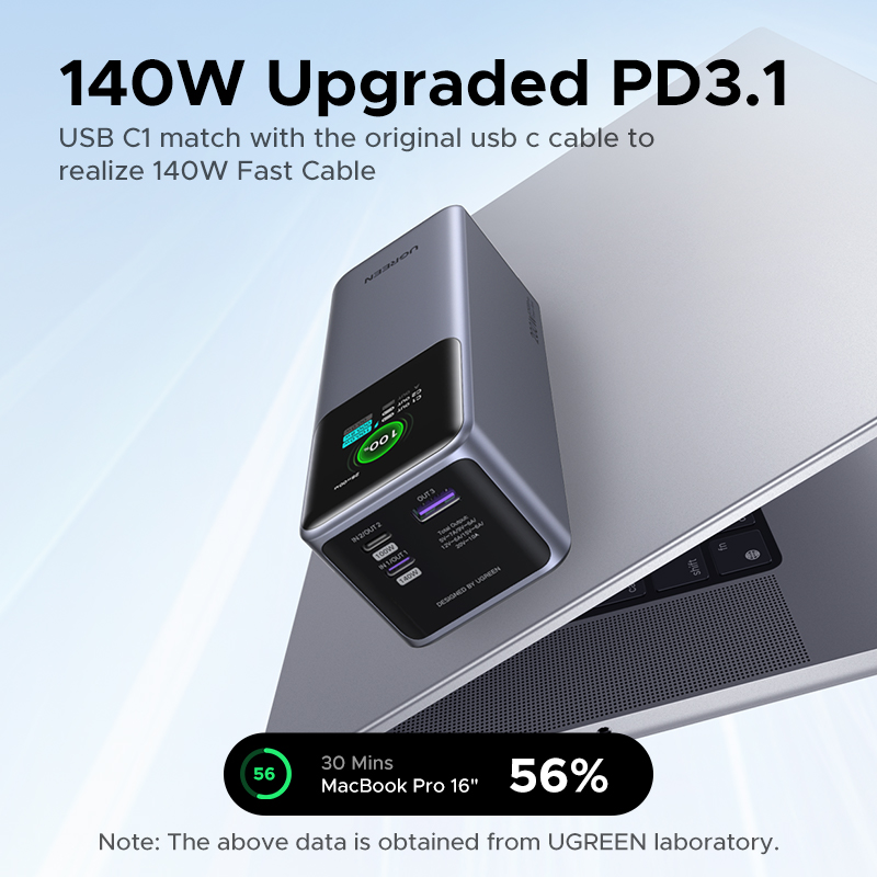 Dual Port Output: C1+C2=100W+100W; C1+USB-A=140W+SCP 22.5W; C2+USB-A=20W total.