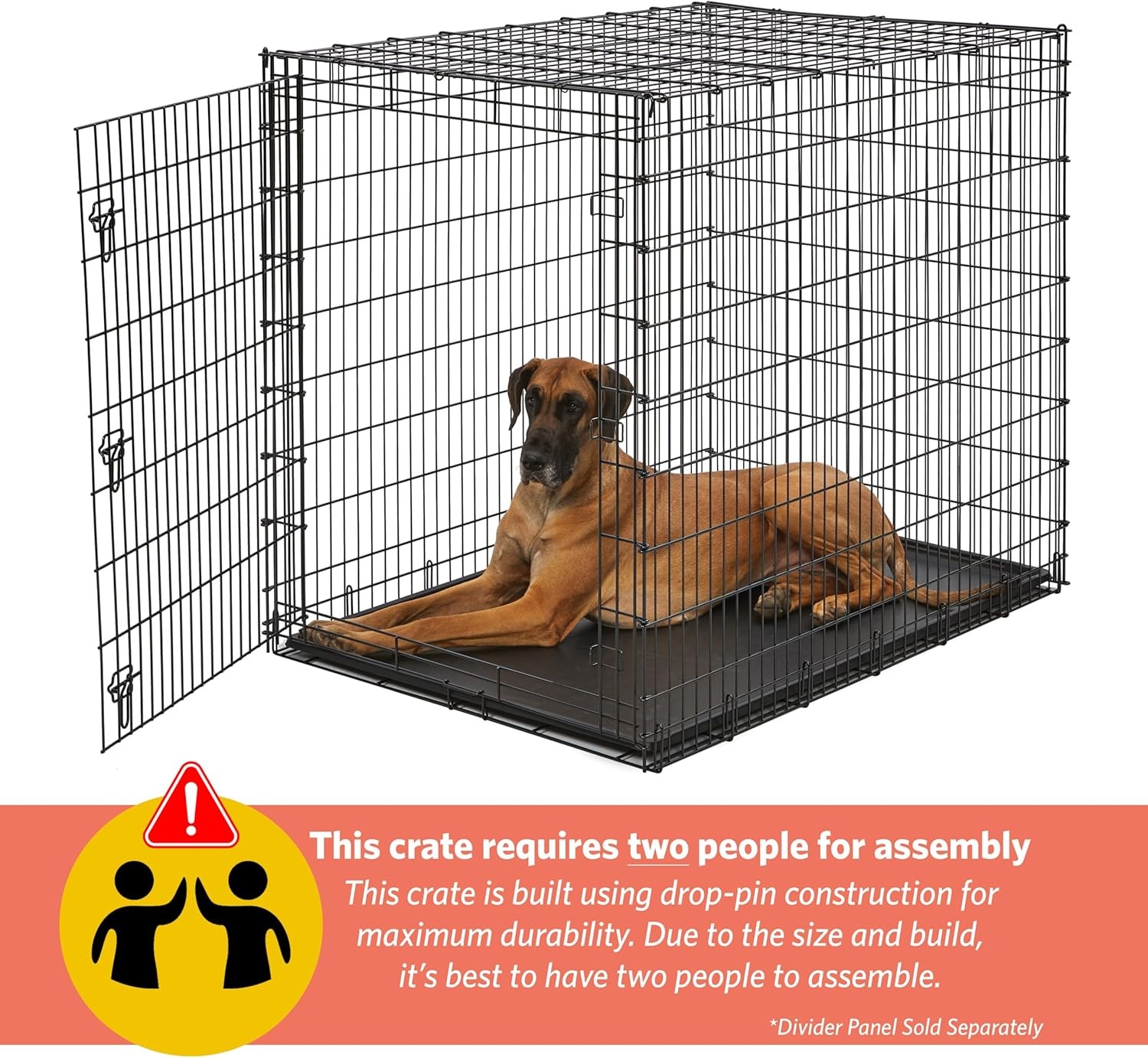 • Unlike our smaller sized dog crates, the 54-inch crate utilizes drop pin construction for maximum durability; this requires two people for assembly, *divider panel sold separately