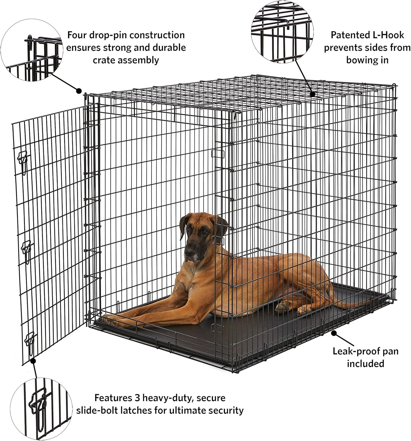 • Drop-pin construction ensures strong and secure dog crate assembly, patented "L" bar on top panel reinforces the dog crate preventing the side panels from bowing inward after assembly