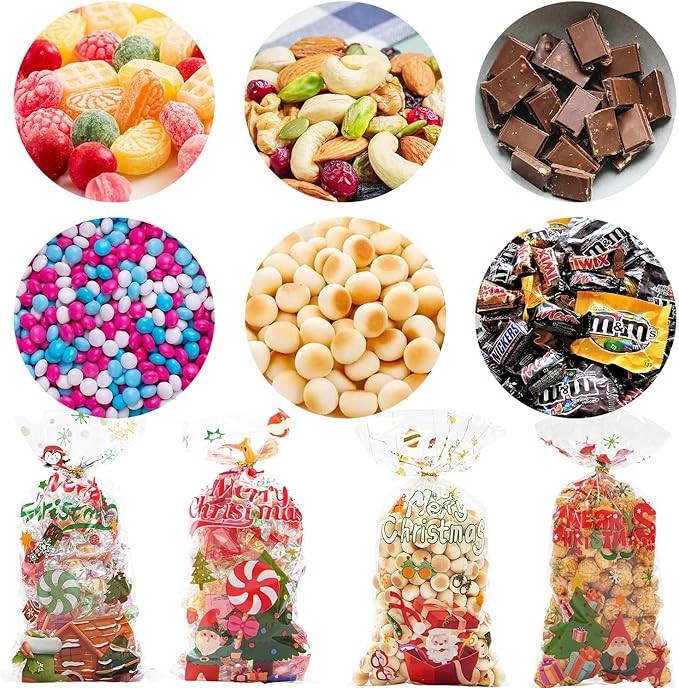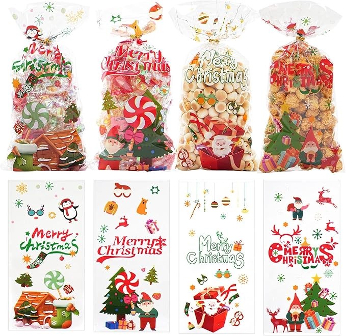 • Christmas Design: Christmas cellophane treat bags has 4 Xmas designs, full of many classic and cute Christmas element patterns, such as Santa, snowman, snowflake, elk and more, which can create Christmas atmosphere in your party.