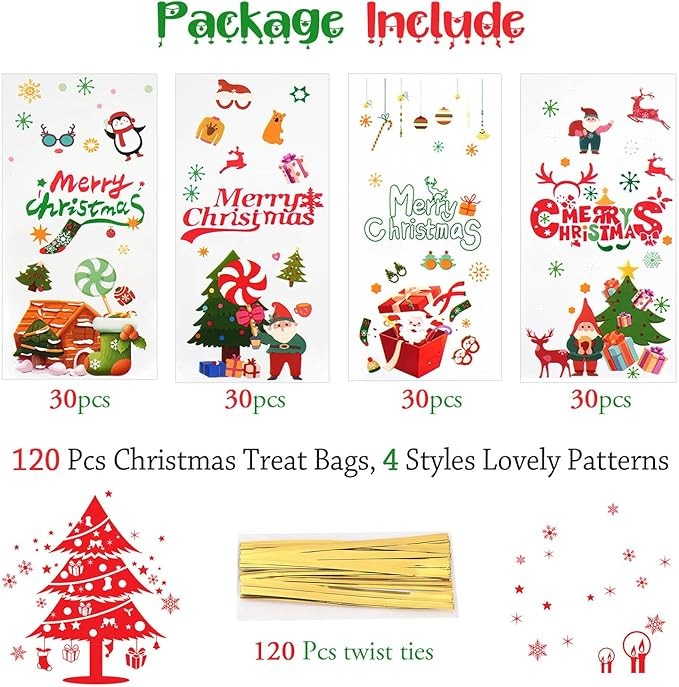 • Christmas Cellophane Bags: You will get 120pcs Christmas cellophane treat bags and 120 PCS twist ties. These Christmas cellophane bags come in 4 different designs 30 of each, enough to meet your various needs.