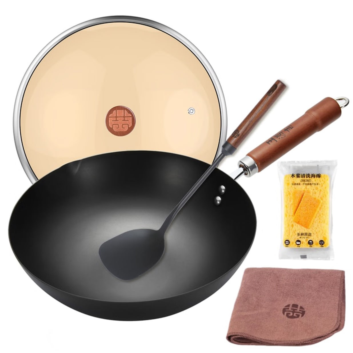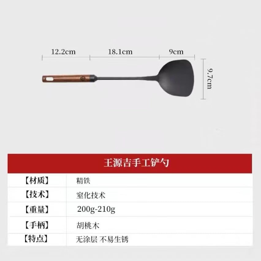 Wang Yuanji Chinese Stir-fry Pan and Spatula, Beech Wood Long Handle, Uncoated, Suitable for 2-4 People, Stovetop Friendly, 30cm (1 Piece)
